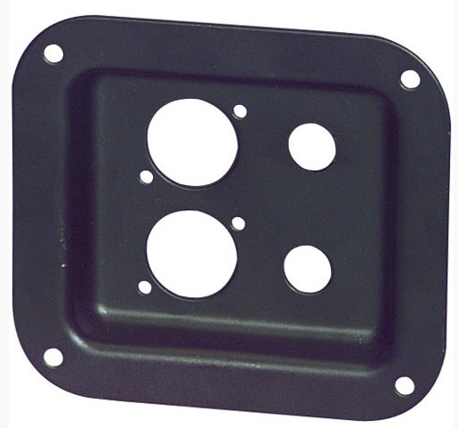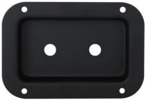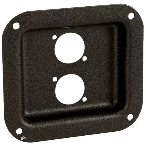 JACK PLATE, BLACK PLASTIC, DUAL 1/4" JACK, SIZE 3 3/8" x 3 3/8". Designed to fit in a 3" round hole, easily cut in a cabinet with a 3" hole saw. Jack mounting hole is 3/8", for most Switchcraft