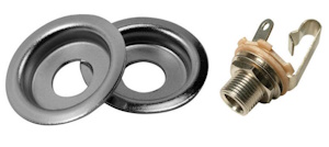 Switchcraft #11 jack with lock washer and trim washer. Outside diameter 2 inches (51mm). Minor assembly required. Designed to fit flush against a 1 1/8" (29mm) cabinet hole. Easy to install - drill 1 1/8" hole in cabinet, attach speaker wiring to jack and speaker, attach plate to cabinet.