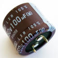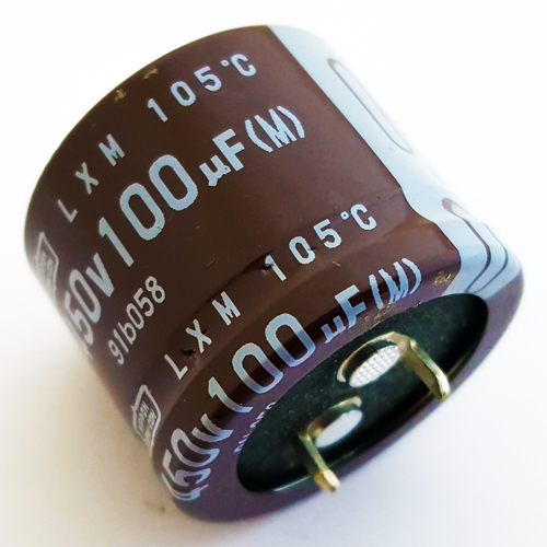 CAPACITOR, electrolytic 100uF @ 450V with radial snap-in leads.    Made by Nippon Chemi-Con.   22mm Diameter, 26mm tall.   Used in many PC board tube amplifiers, such as Marshall™, Orange, Randall™, B52, Crate, Peavey, many others.