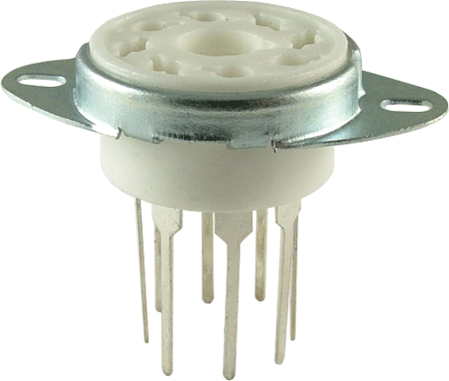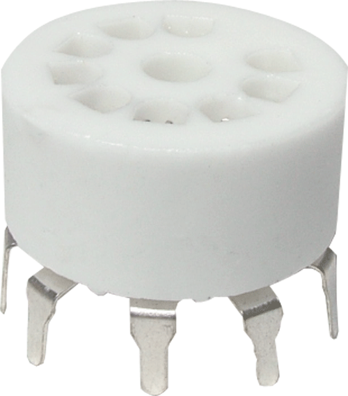 TUBE SOCKET FOR MINIATURE 9-PIN TUBES. PC MOUNT, CERAMIC. 9 pin ceramic PC mount socket, stand-off mounting,