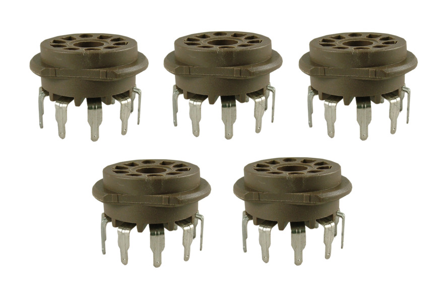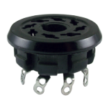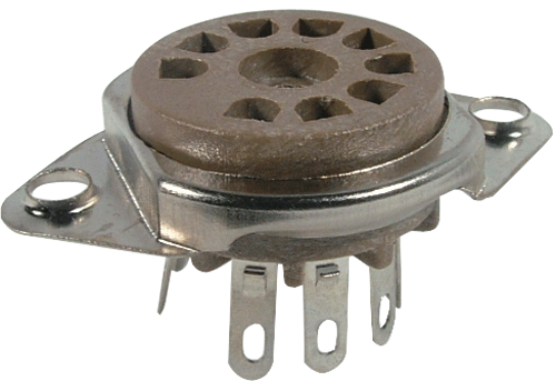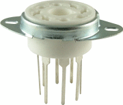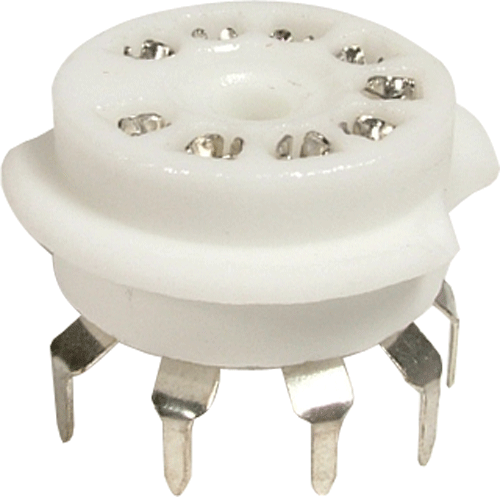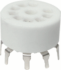 TUBE SOCKET FOR MINIATURE 9-PIN TUBES. PC MOUNT, CERAMIC. 9 pin ceramic PC mount socket, stand-off mounting, 0.82" diameter, 3/8" tall