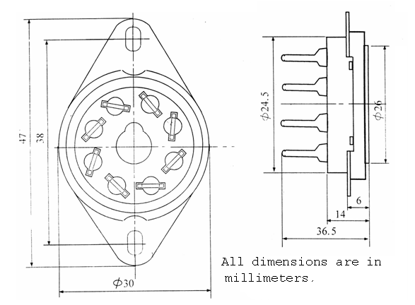 TUBE SOCKET FOR MINIATURE 9-PIN TUBES. EXACT REPLACEMENT FOR MANY MAKES AND MODELS OF AMPS WITH HAND-WIRED TUBE SOCKETS. Fits 12AX7, 12AU7, 12AT7, 6BQ5, EL84 tubes. For 3/4" hole. Bottom mounting (mounted from the inside of the chassis), mounting holes spaced 1 1/8" apart. Designed to work with the